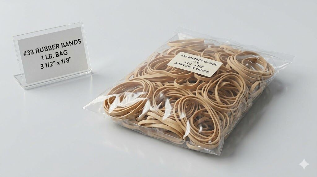 1 lb. Bag of #33 Rubber Bands 3 1/2″ x 1/8″ offer a reliable, durable, and versatile solution for organizing and bundling tasks. Whether you’re streamlining your office, tidying up your home, or engaging in creative projects, these #33 rubber bands deliver strength and flexibility in a convenient bulk package. Their medium size makes them adaptable for a wide range of uses, and their natural tan color ensures a clean and professional appearance.