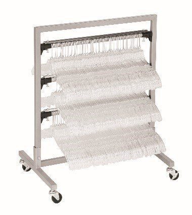 The 3 hanger bar mobile collection rack for hanger management offers versatility and efficiency when capturing, sorting, and transporting hangers. Freestanding 3 hanger bar capacity is adjustable to widths of 21″, 24”, or 30”. Fully loaded hanger capacity is 135-210 hangers, depending on the adjusted width. Included are four 2” casters (2 swivel, 2 brake). Collection rack measures 18” D x 22 5/8” W x 33 ¼” H. Hanger bars are sold separately from collection racks. Additional information: