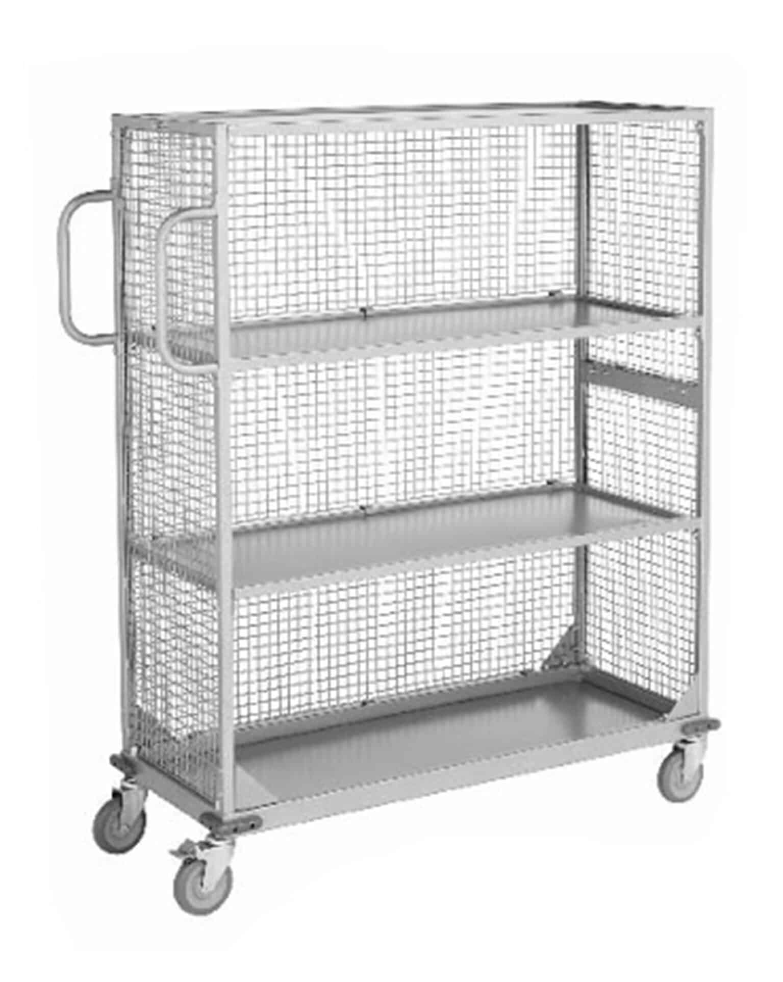 4 Shelf Merchandise Cart easily transports large or heavy items to and from workroom and sales floor with this 4-shelf (considering the top shelf) larger sized yet “floor-friendly” cart.  Merchandise carts have a load capacity of up to 1,000 lbs.  Each shelf is solid, has a reinforced steel frame with a 1” lip to aid in preventing merchandise from falling off.  Each 4 Shelf Merchandise cart unit comes with the following: