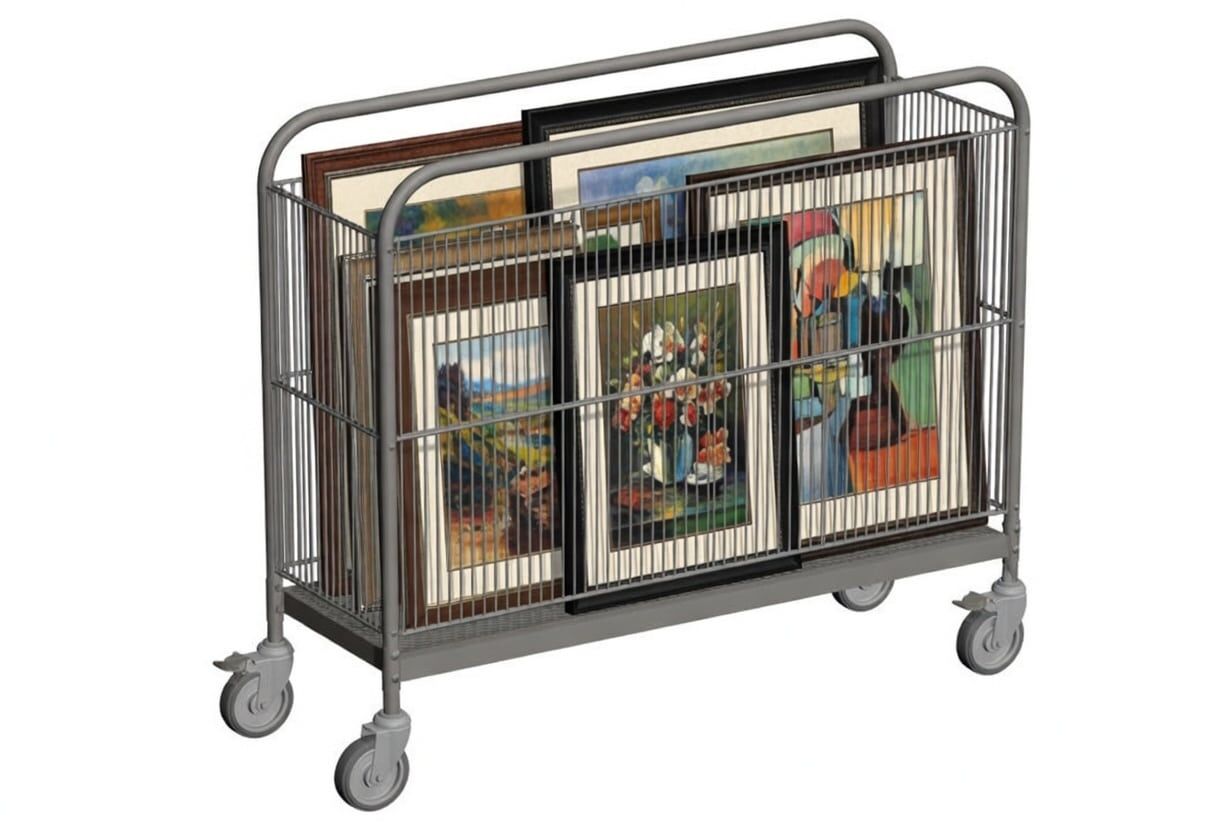 - Art cart organizer for large goods is versatile enough to hold smaller items, making it a highly efficient solution for retailers, galleries, or studios.
