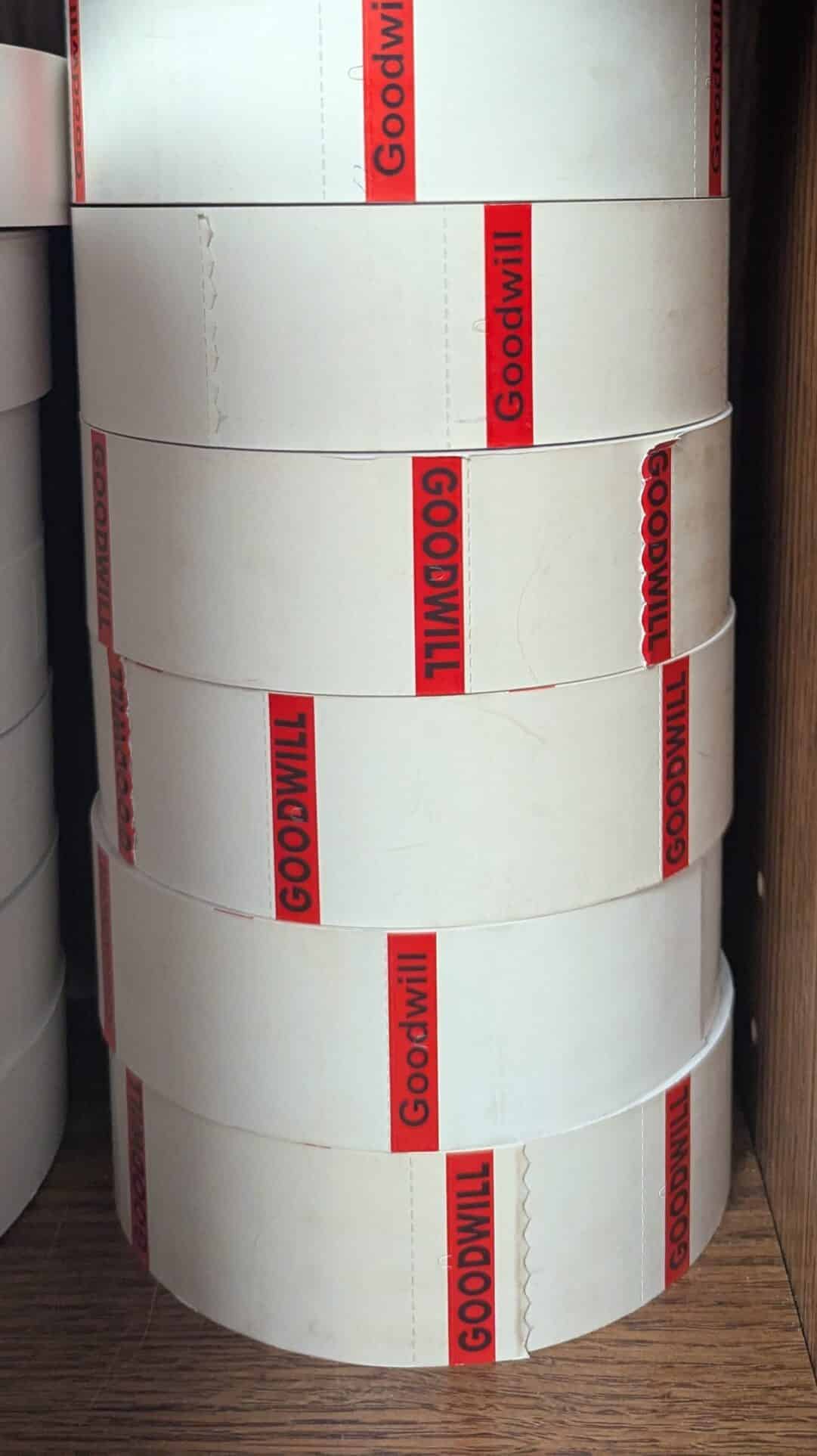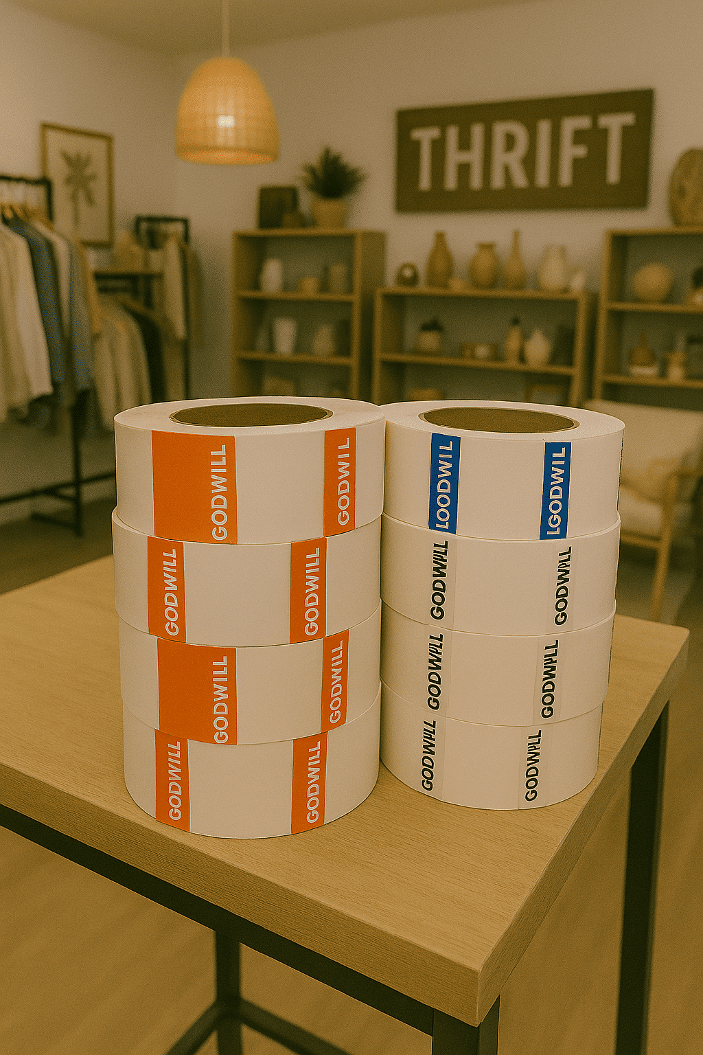 GW Direct Tag is 1.5″ x 2.75″ white direct tag is crafted from durable 7pt stock and features a bold reverse color bar with the “Goodwill” logo for standout branding. Designed with a horseshoe cut and perforation for easy separation, each tag is wound on a 1″ core and includes a black mark (BM) for printer sensing. Available in Blue, Black, Red, and Orange bar colors, with 900 tags per roll, this tag is ideal for efficient, high-volume labeling in retail or donation center environments.