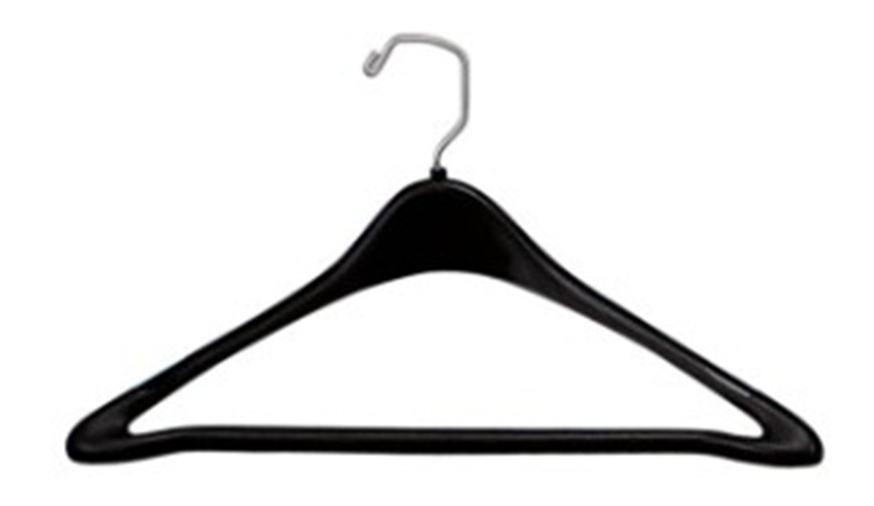 This new black contoured 17” suit hanger is a thick, molded plastic that provides soft, rounded edges perfect for a suit jacket. The bar is stationary, staying in place when laying trousers, jeans, or skirts across it. Heavier outerwear, sweatshirts, long dresses, and even linens will benefit from the shape and strength of this great hanger. The chrome color metal hook swivels for easier hanging.