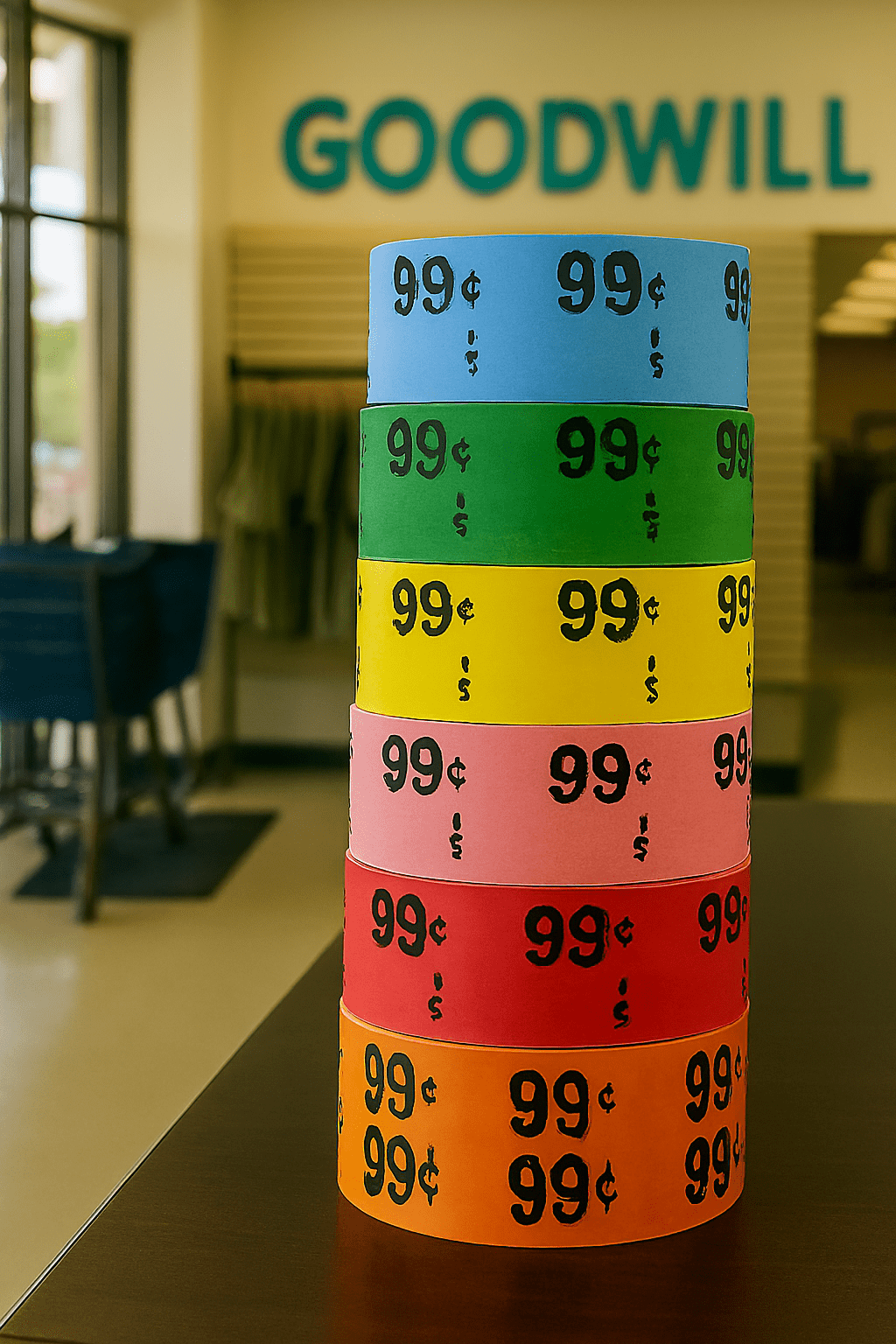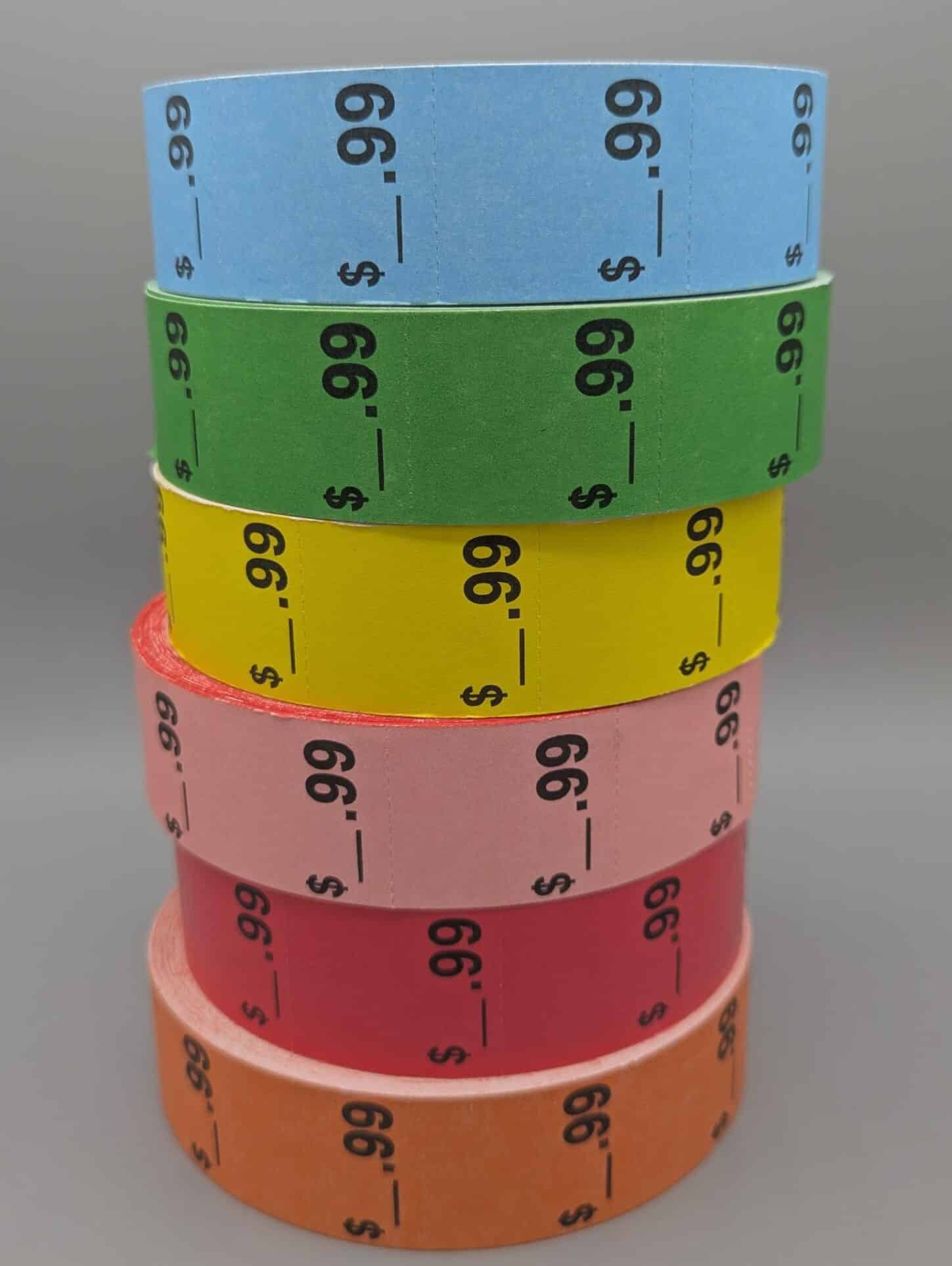 Price 99 Cents Tag is a vibrant 10pt uncoated transfer tag is designed to grab attention and streamline pricing. Measuring 1.25″ x 1.25″, it features two-sided color for maximum visibility and comes preprinted with a bold $0.99 price point—perfect for retail, thrift, or promotional use. Each tag includes a hole with tic mark for easy tagging and a perforation for clean separation. Supplied on a 1″ core with 1,135 tags per roll, it’s available in Red, Orange, Yellow, Pink, Blue, and Green to suit your color-coding or branding needs.