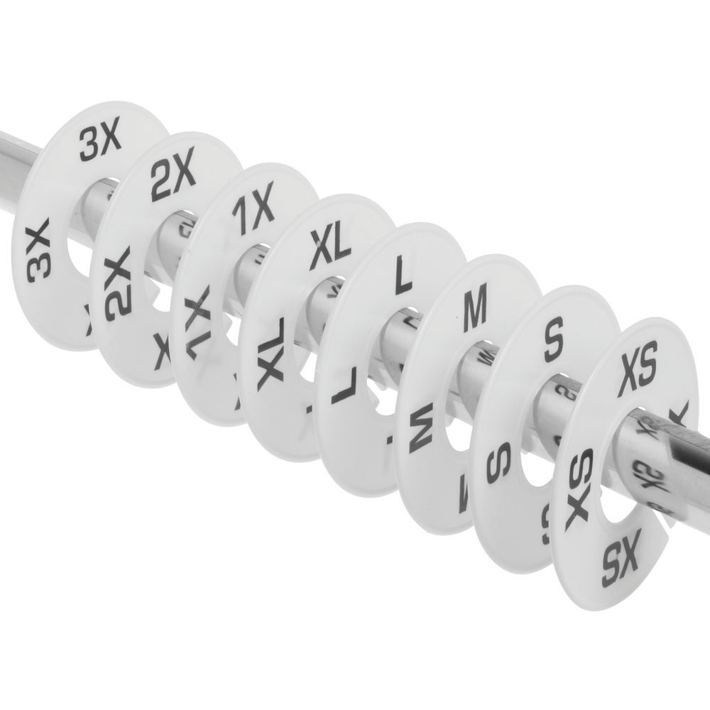 - The White Plastic Round Unisex Size Dividers XS-3X have a slit opening for quick placement on hanger rack.