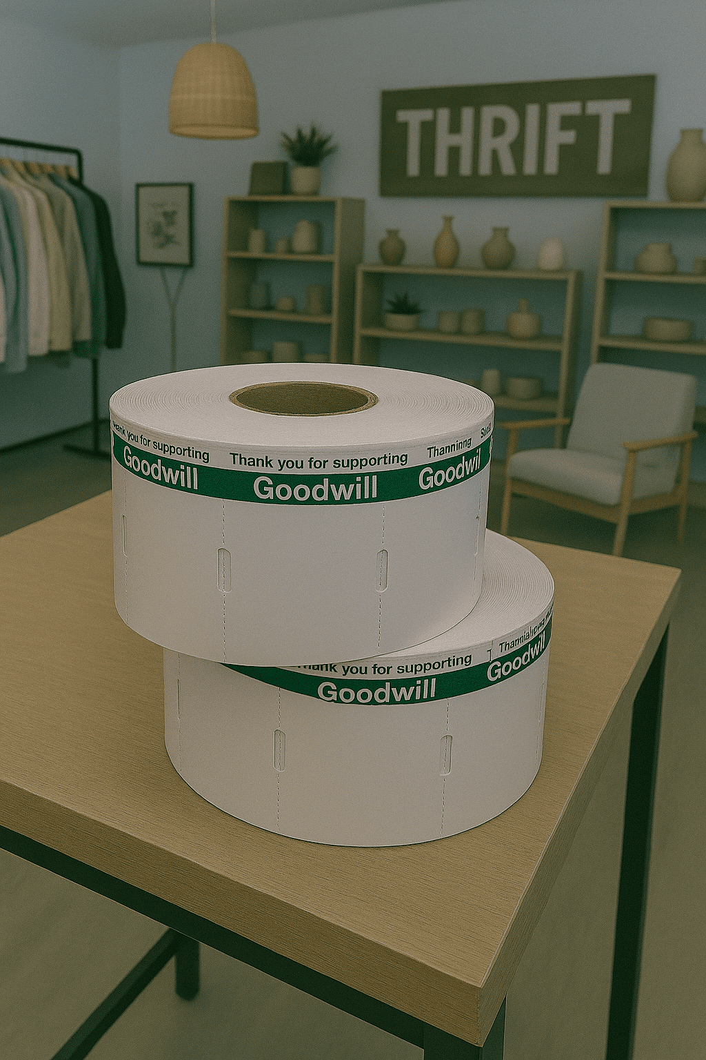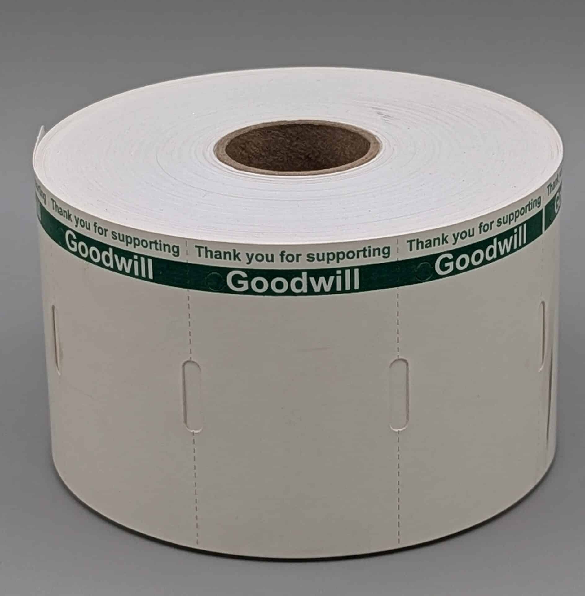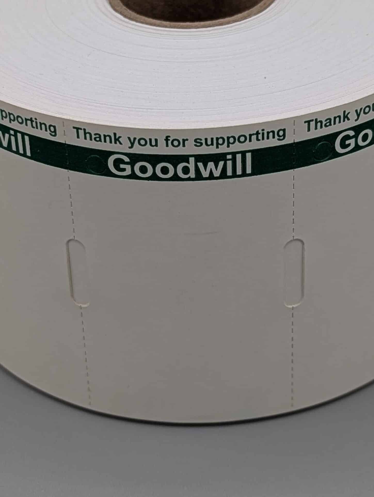 White Thermal Direct Tag with Green Reverse “Thank You” Print is a 7pt white thermal direct tag delivers both function and message in one compact design. Measuring 2.25″ x 1.375″, it features a bold green reverse print that reads “Thank you for supporting Goodwill”, making it ideal for branded retail or donation center use. The tag is die cut with a perforation for easy separation and includes a hole positioned beside the Goodwill print for convenient hanging or tagging. Each roll contains 967 tags on a 1″ core, compatible with most direct thermal printers.