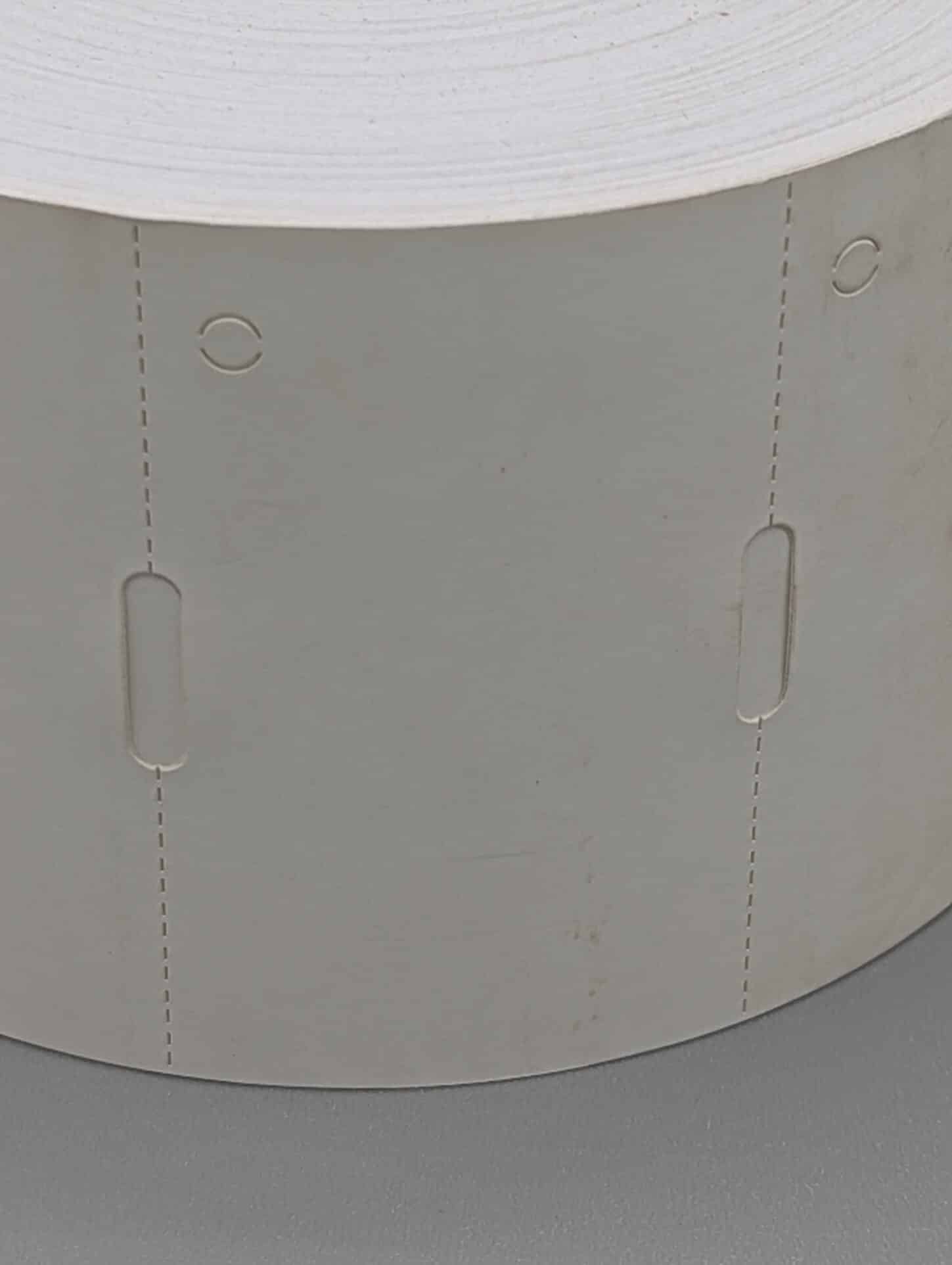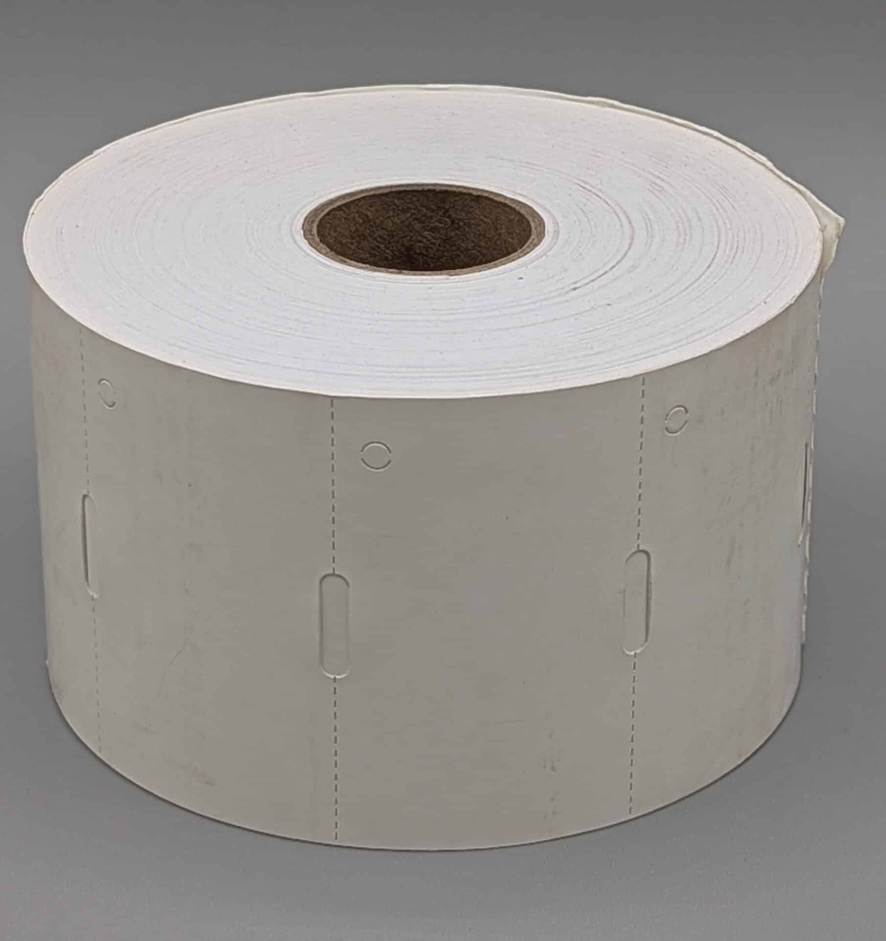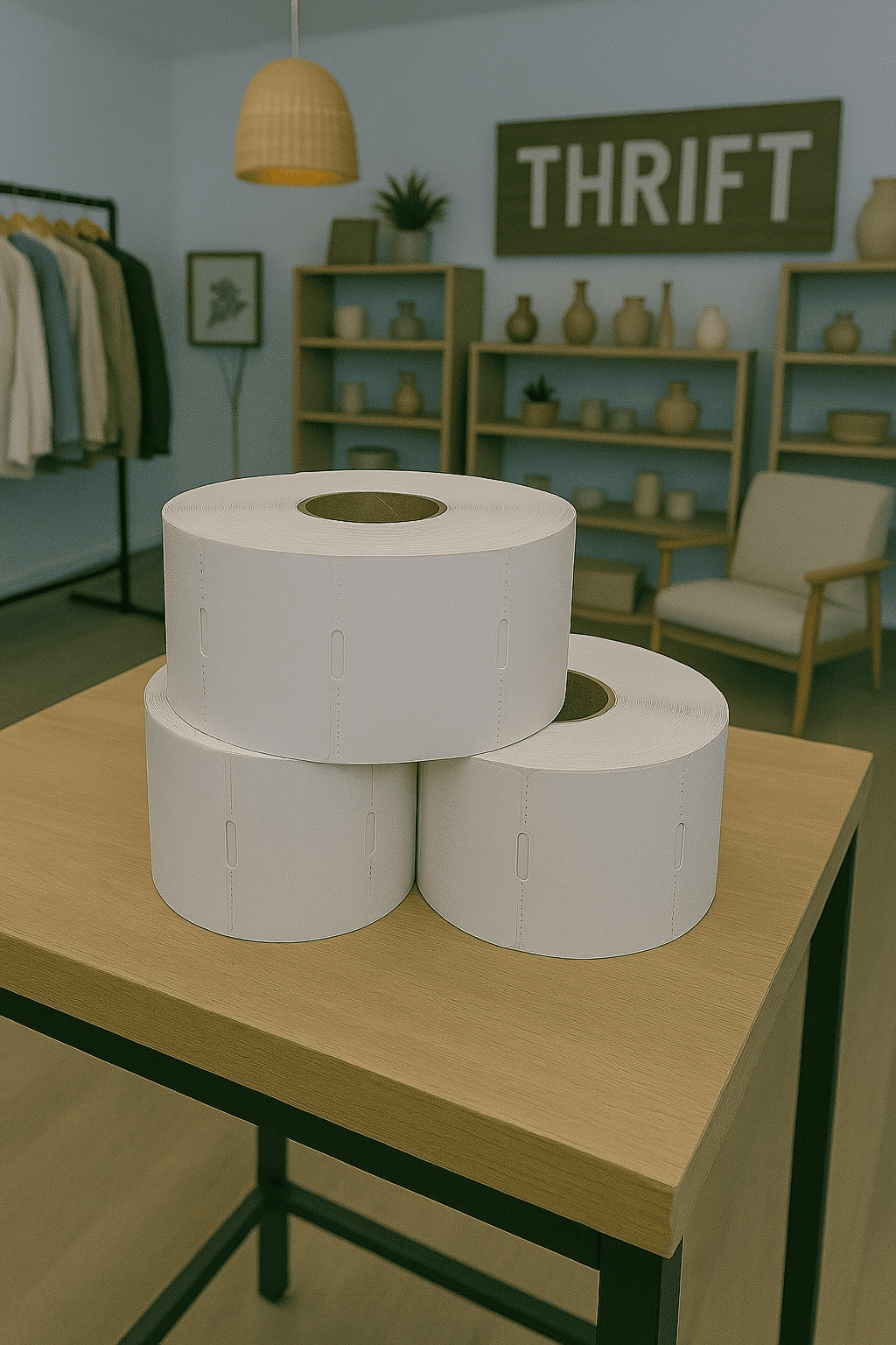 White Thermal Direct Tag is a 7pt white thermal direct tag is designed for efficient, high-volume labeling. Measuring 2.25″ x 1.375″, it features a die-cut shape with a perforation for easy separation and a hole positioned on the upper left corner for convenient hanging or tagging. Each roll includes 967 tags wound on a 1″ core, making it compatible with most direct thermal printers used in retail, inventory, or donation center environments.